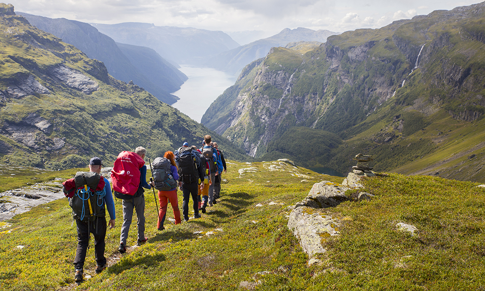 Fra snøkledte vidder til blomstrende frukttrær: Fjellturen fra Hallingskeid til Osa er en historisk vandrerute hvor du går fra fjell til fjord på en dag.