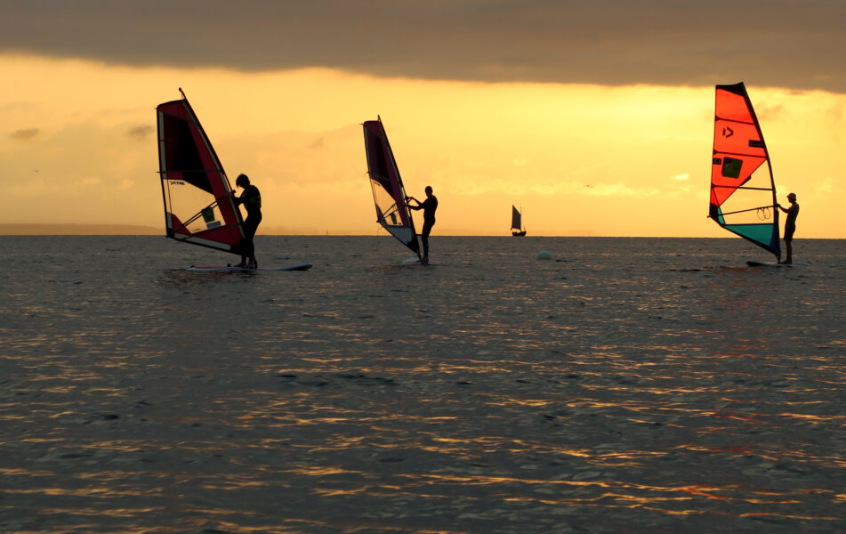 En drøss med seilbrett i regnbuens farger flyter sakte over sjøen. Det er flau vind denne dagen, men for nybegynnere med seil og brett er det gode forhold for å bli kjent med vannsporten.