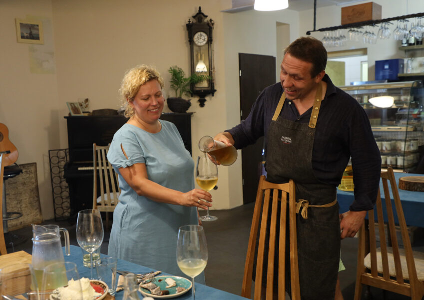 Han lager sin egen vin av løvetann. Smør med kaviar. Ruller med brisling, fat med sildetartar og rykende varm torskelever. Klassiske retter fra denne kysten, men også ispedd kreativitet: Til dessert får jeg fløteis med biter av tørket fisk (overraskende godt!), fortellinger om piratenes herjinger og lokal identitet – og mer lokal vin.