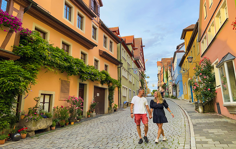 Start turen i Wurzburg i nord med et besøk på Wurzburg-slottet og en vandretur i de overdådige hagene. Herfra starter roadtripen, gjennom et utall små og vakre landsbyer, bølgende landskap og vingårder. Formelt starter Den romantiske veien vest for Wurzburg, men vi tar en liten tur østover først til Iphofen, hvor du kan smake klassiske Silvaner-viner på runde, grønne flasker på for eksempel Hans Wirsching Winery. Så svinger vi inn på Den romantiske veien igjen og setter nesa rett mot høydepunktet Rothenburg Ob Der Tauber. Den utrolig vel bevarte bykjernen med brosteinsbelagte gater og originale hus med bindingsverk og dekorasjoner stammer helt fra Middelalderen og er velfortjent på UNESCOs verdensarvliste. Sett av et par netter her for å ta inn byens skjønnhet og historie. Videre ned mot badeliv og Disneyslott i Füssen er det verdt å stoppe innom flere av de nydelige byene langs veien, som Dinkelsbühl, Nördlingen og Harburg, hver med sin egen sjarm. Sett av den siste dagen til å utforske to av Tysklands mest berømte slott – Neuschwanstein og Hohenschwangau.