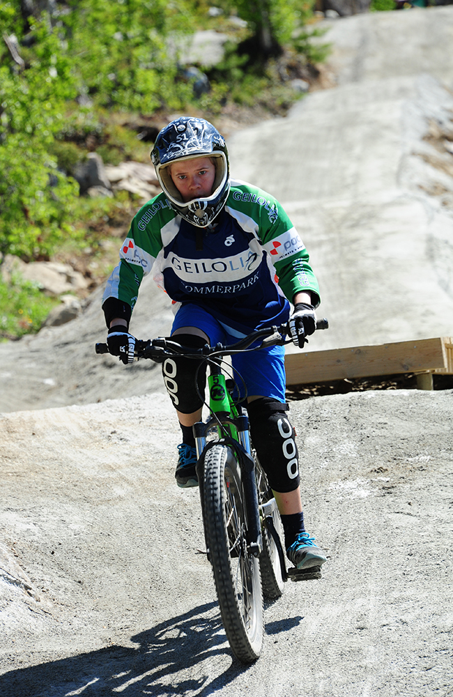 Downhillsykling krever konsentrasjon, og mer kjernemuskulatur enn man skulle tro, lærer Andreas Steinestø (13) raskt. Foto Torild Moland