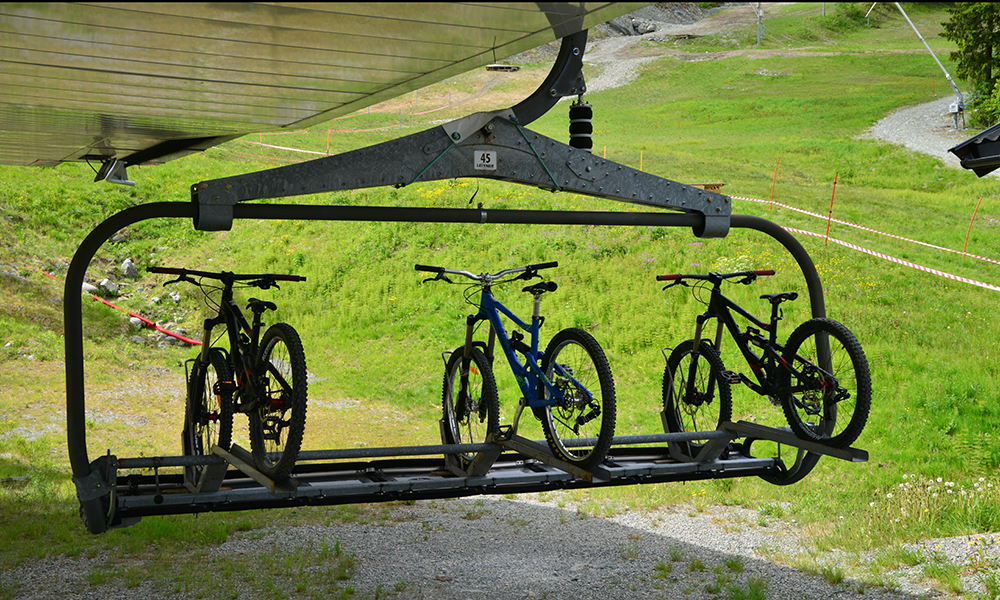 Fra toppen av Hollvin Expressheis ser den bratte og svingete bakken ut omtrent som på vinterstid, med unntak av fargen. For nå har vinterens hvite kappe måtte gi tapt for sommerens grønne teppe, og slalomskiene er byttet ut med fulldempede sykler.