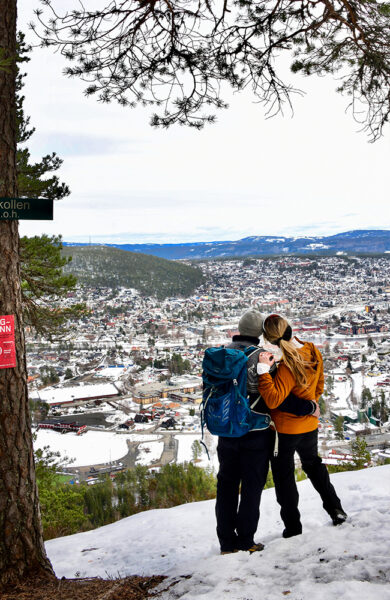 Etter tjernet svinger stien brått opp til høyre, men det er godt merket med skilt og lett å finne fram. Og plutselig er vi der, på toppen av kollen, og kan skue ut over hele vide, vakre Kongsberg.