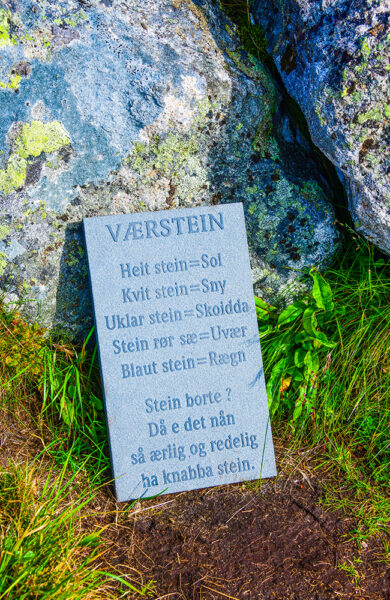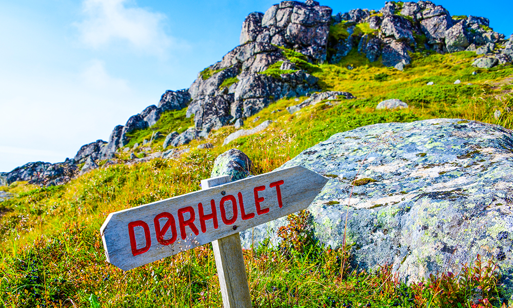 Rett før toppen ta en liten avstikker til Dørhollet – et hull i fjellet under en kampestein. Opp og ned samme vei.