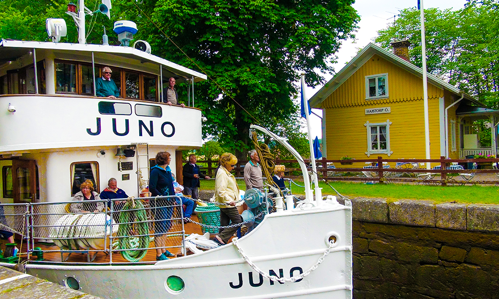 Kanalen benyttes av lokale, av svenske turister, skandinaver på valfart og andre turister som vil oppdage en av Sveriges vakreste vannveier. Men den er like fin fra den bilfrie grusveien langs kanalen der vi tråkker. Underveis stopper vi for å betrakte slusene og de gule slushusene like ved. Vi blir stående å se på mens vannet suser inn med stor kraft og båtene heves og senkes. Fartøyene som sluses flere meter opp og ned mellom ulike vannstander i kanalen er en stor del av sykkelopplevelsen.
