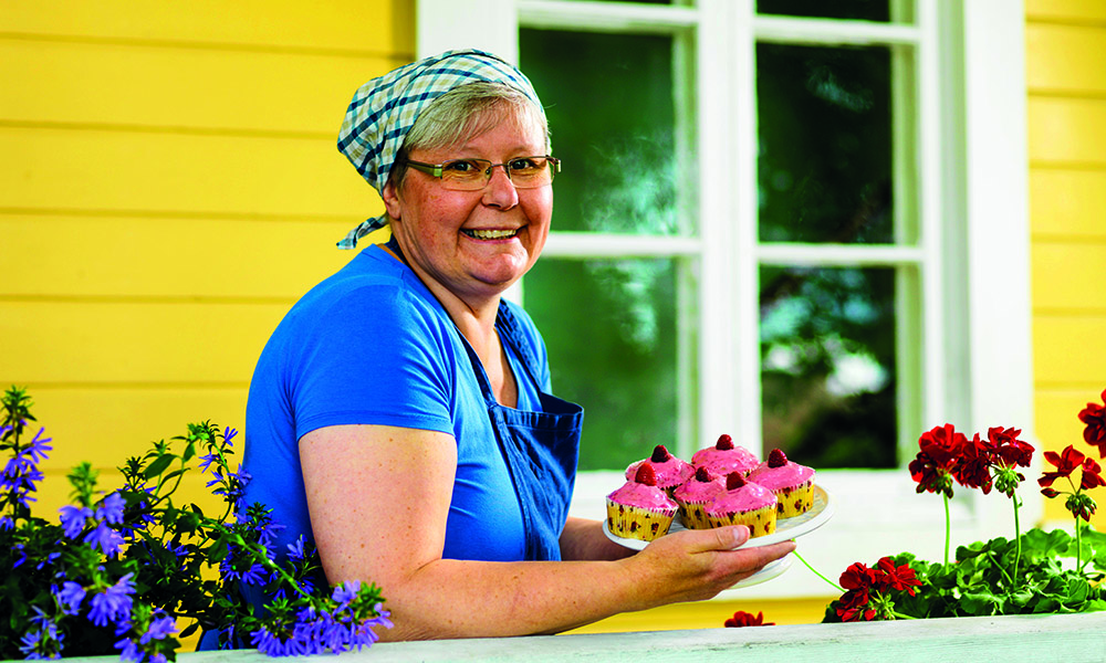 – Hjemmelaget rabarbra- og bringebærpai toppet med en dæsj vaniljeis! Marianne Ljungström byr fram en tallerken og smiler bredt.