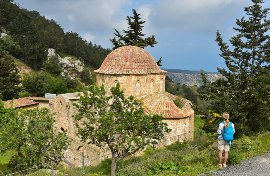 Langs hele den vakre kysten nord på Kypros rager de storslagne Kyreniafjellene som grønne vakttårn. Det er over 230 kilometer med godt merkede stier på kryss og tvers i de vakre fjellene, som går ned til kysten, opp igjen i fjellet, over bratte fjellrygger og innom små landsbyer. Her går det en langdistanserute helt fra Andreas-klosteret i Karpaz nasjonalpark på den nordøstlige tuppen langs hele nordkysten i 18 dagsetapper. Men man kan selvfølgelig velge å bare gå noen av dem, eller ta dagsturer fra en behagelig hotelltilværelse ved sjøen. Stiene går vekselvis på grusvei og skogsstier, gjennom velduftende trær og grønne, blomstrende enger. Nord-Kypros er kompakt, og ingenting er mer enn en time eller to unna. Skal du bare gå én dagstur kan vi anbefal turen fra Esentepe opp til det fantastiske Antiphonitis-klosteret. Bygningen har vakre fresker som beskriver bibelske historier og kristendommens helgener, og kan dateres helt tilbake til 1200-tallet.