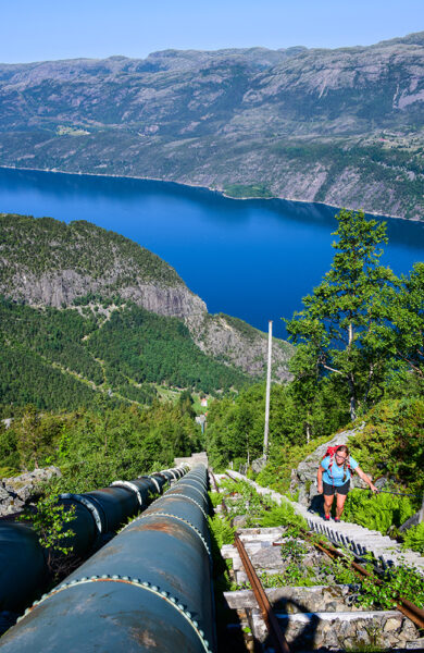 Det går opp, opp, opp. Vi har hoppet av båten i den historiske kraftbygda Flørli og skal gå verden lengste tretrapper – 4444 trinn som følger rørgata fra kraftstasjonen nede i Flørli til Ternevatnet 741 moh.