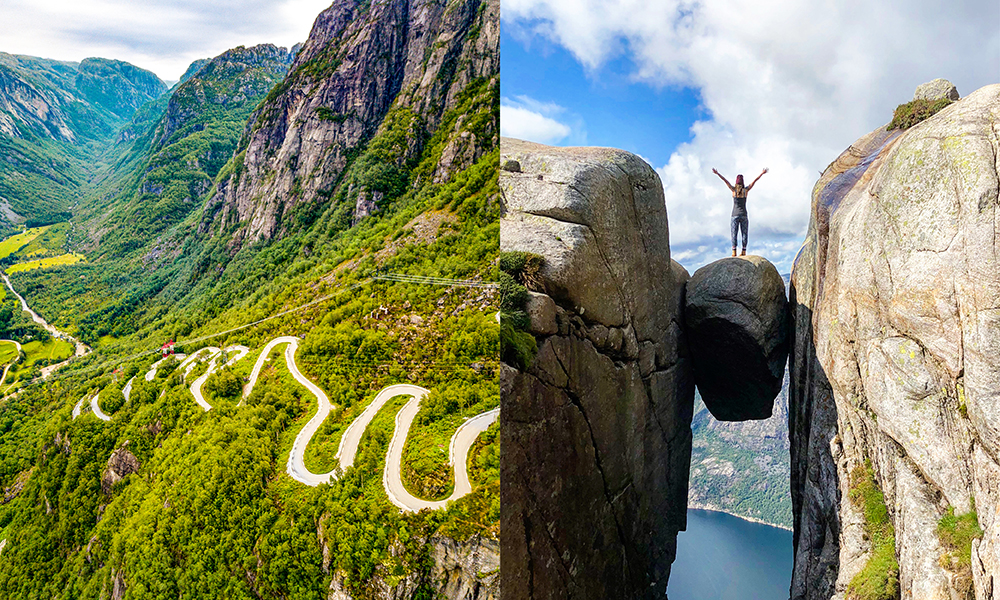 En liten stein på 5 m³, kilt i en kløft i fjellet, er blitt en av landets mest populære fotturmål (t.h.). Veien opp fra Lysebotn til startpunktet er verdt turen alene (t.v.). Foto: Istock