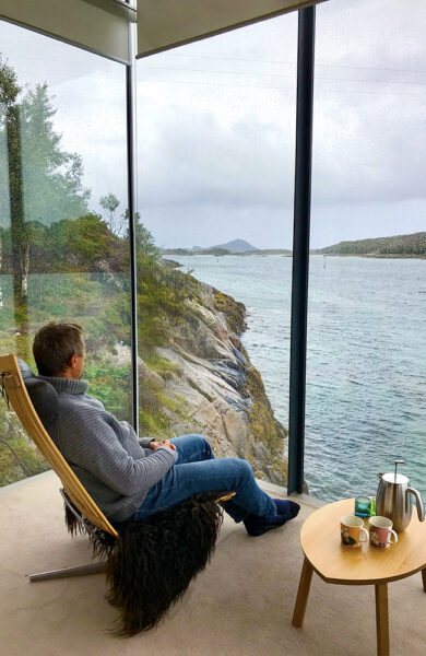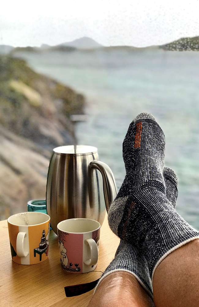 Etter endt tur skulle vi gjerne tatt en velfortjent hvil i boblebadet. Isteden blir det en kopp varm kakao inne i hytta, godt tilbakelent på myke saueskinnsfeller i lenestolene, med utsikt over hav, fjord og fjell.