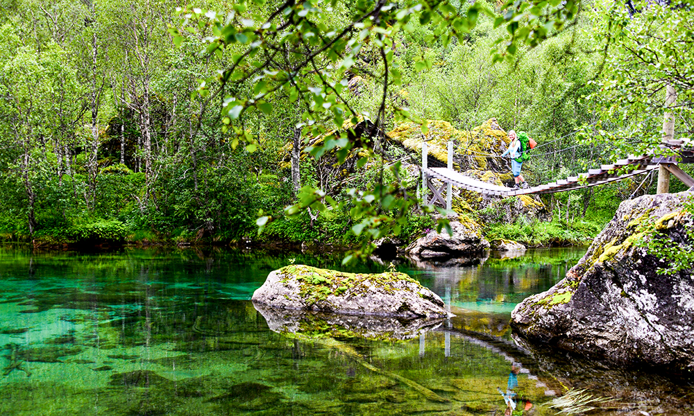 Turen starter med en bratt oppstigning fra parkeringsplassen og følger deretter elva fra Storskogvatnet, som også er dagens endelige mål. Etter bare et par kilometer krysses elven over en krum hengebru i tvinnede tau som speiler seg i klart fjellvann, med mosedotter spredd over flaten som hårtustene til Nøkken. Det er som hentet ut av Tolkiens magiske univers, et sted der alvene gjemmer seg bak lavdekkede trestammer og dvergene venter inne i fjellet. Instagram-feberen vinner over gå-iveren.