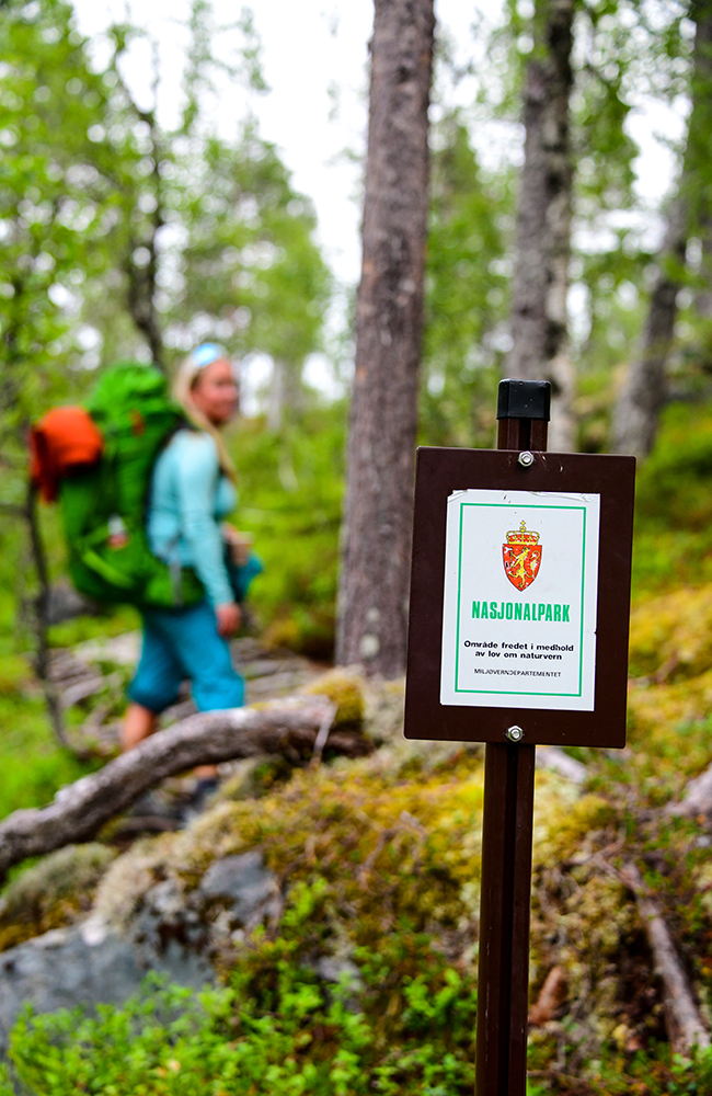 Herfra går turen over myrlendt terreng og glissen furuskog, og etter en time kommer vi fram til skiltet som markerer grensa til Rago nasjonalpark. Fargen på merkingen bytter fra rødt til gult, som den er inne i hele parken. Vi kan se både Ragotoppen og Litlrago, og et sted skimtes til og med den mektige Litlverivassfossen, et delmål for turen.