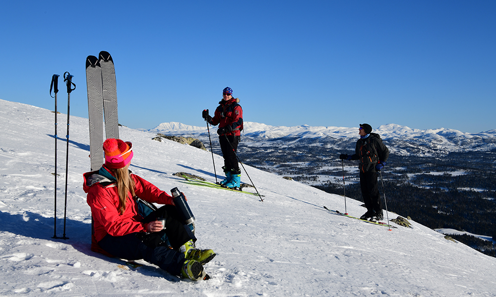 Det er overraskende lett å gå oppover med feller under skiene. Bindingene sitter løst, og ned igjen tar man av fellene og spenner fast bindingene. For erfarne fjellkjørere er det bare en drøy time til Heimare Skarsnut, noe lenger til Ausatre Skarsnut. Og det er jo derfra belønningen kommer – kilometer på kilometer med urørt terreng ned igjen. Det er bare å kaste seg utfor og nyte adrenalinet!