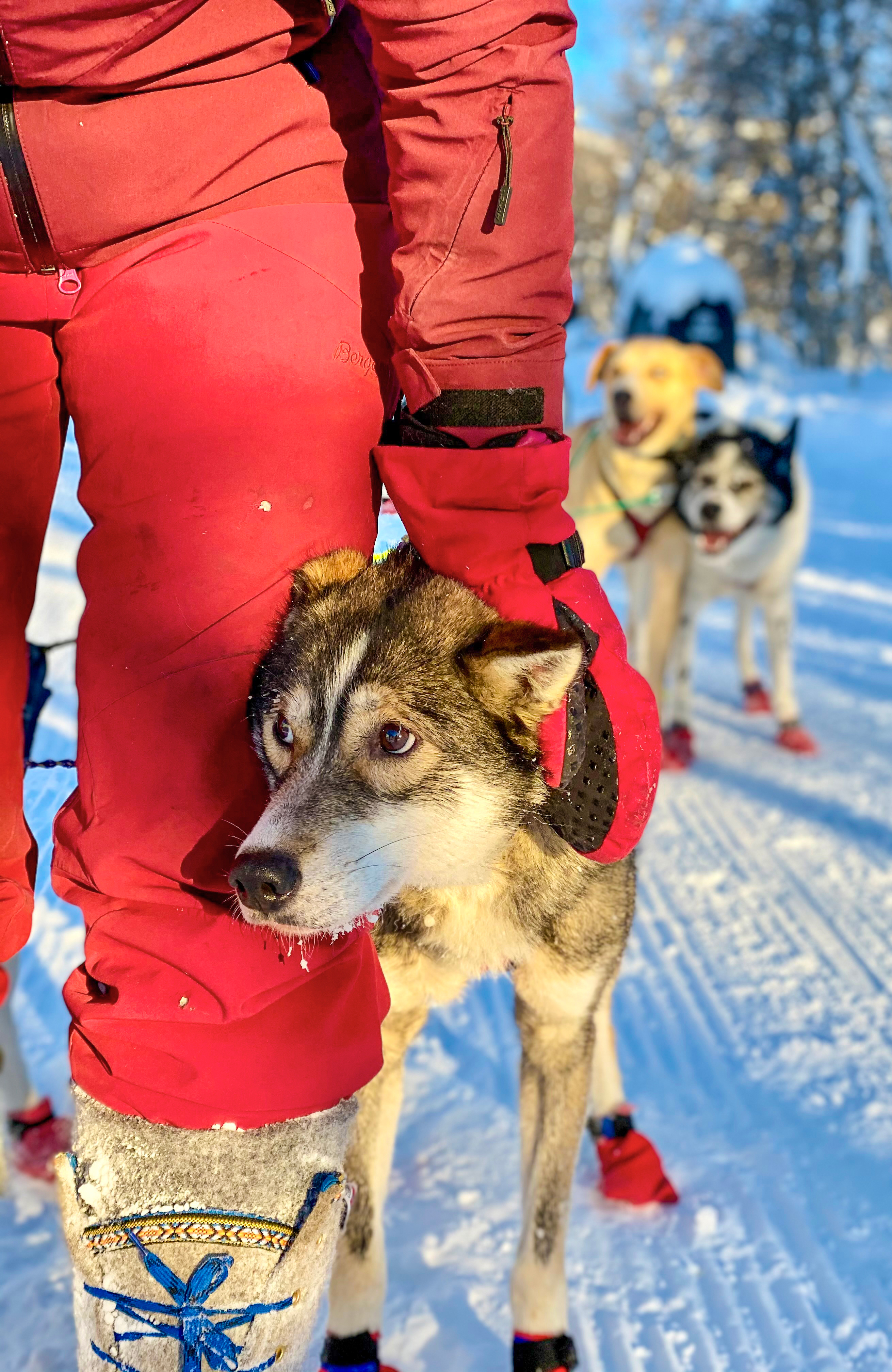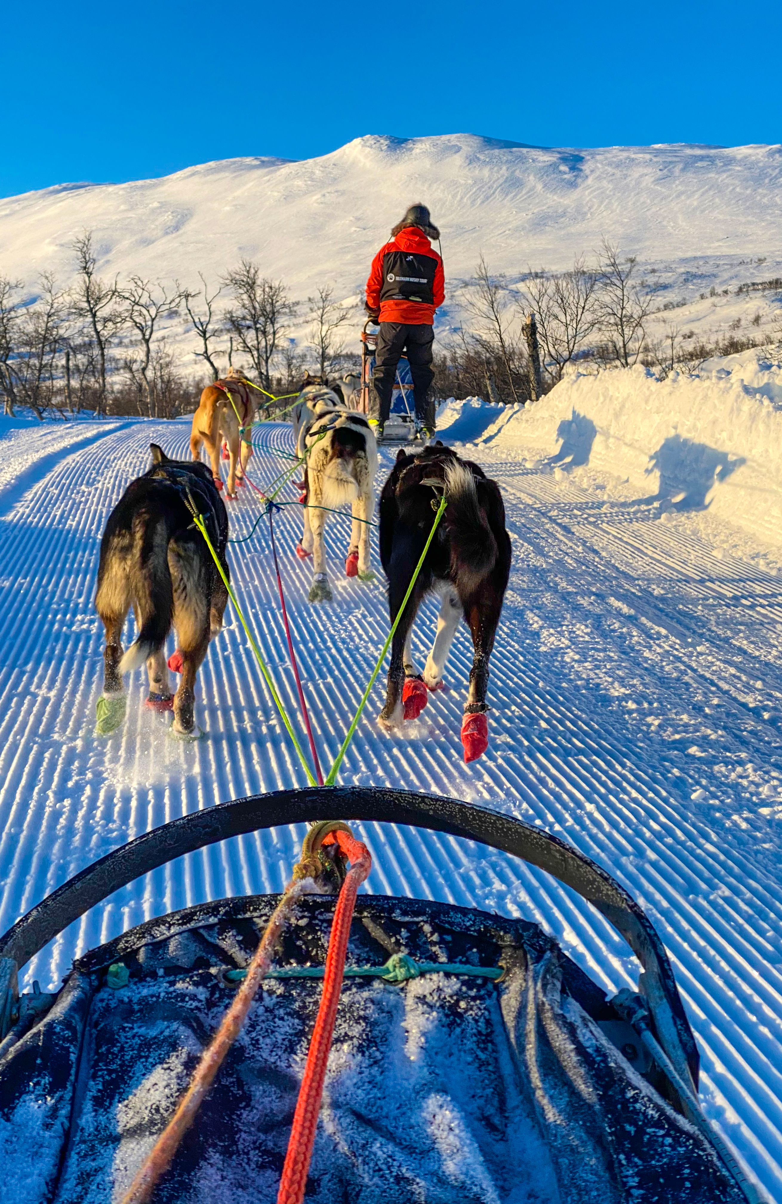 Bak i sleden er det godt og varmt. Luften er kald og rolig, og det er ingen lyder å høre bortsett fra hundene som peser og sleden som sklir over hardpakket snø. For en behagelig opplevelse!