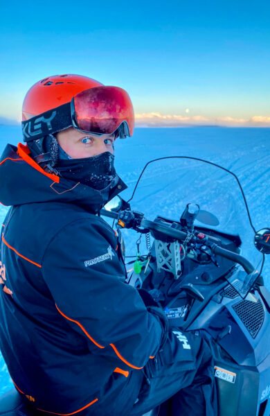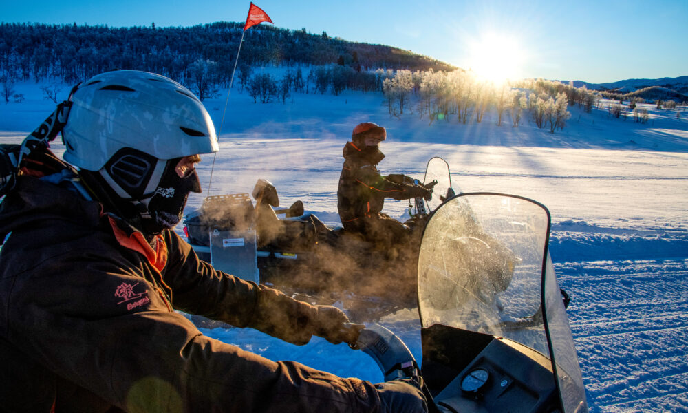 Han har fyrt opp to snøscootere og er klar for en tur i morgensola, trass i at gradestokken viser 20 kalde. Men godt pakket inn i fire lag med ull og vindtette klær kan vi rase over vidda uten å fryse ihjel.