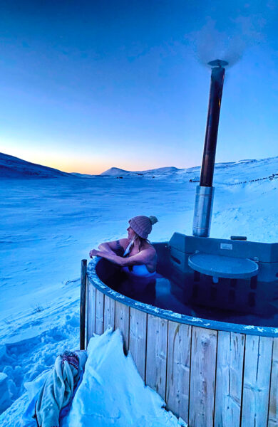 Du går fra hytte til hytte i Norges råeste natur, mens bagasjen blir fraktet med beltebil. Vel framme venter peiskos, vin og treretters middag.