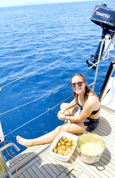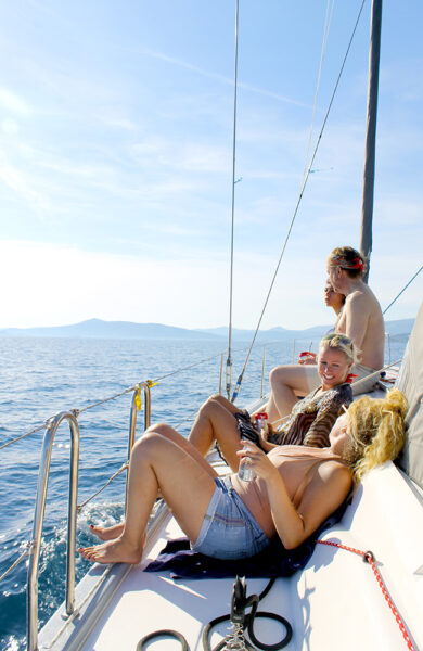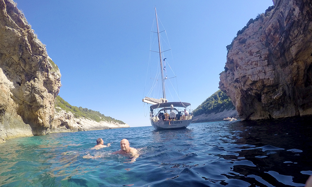 Mesteparten av tiden benyttes uansett i sola på dekk, eller ute i vannet. Når det er tid for lunsj setter vi oss under solskjermen bak på båten der vertinne «Bella» disker opp med hjemmelagede pitabrød fylt med grillet kjøtt, grønnsaker og tzatziki før vi igjen heiser seilene og glir videre oppover kysten.