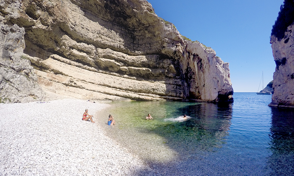 Vi ankrer opp, hopper over bord og legger på svøm. Og der, inne i en bortgjemt bukt dukker det opp en liten, vakker strand. Det turkise vannet, den perlehvite rullesteinstranden og det koselige, lille steinhuset med en liten kafé er som tatt ut av en drøm. Og når det hele er omringet av grønnkledde, bratte klipper er det ikke vanskelig å forstå at Stiniva Bay i 2016 ble kåret til Europas fineste strand av turistorganisasjonen European Best Destinations.
