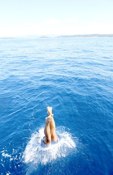 Skipper Fredrik nikker bekreftende og stopper skuta. Kun to sekunder senere høres et stort plask. Vi rekker ikke å seile lengre enn at vi fortsatt kan skimte fastlandet og utgangspunktet vårt i Primošten før det er tid for første dukkert.