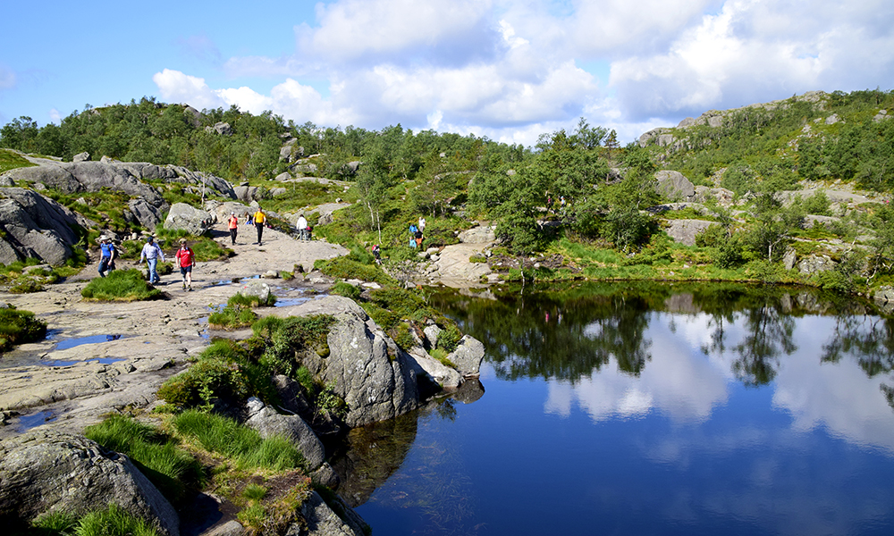 Klokken er åtte på kvelden og det er en av årets lyseste netter. Solen har ifølge Yr.no planlagt å takke for seg 22:42. Vi har altså god tid. Norges mest populære fottur er «bare» 3,8 kilometer lang og beregnet til å ta rundt to timer. Det at den er så tilgjengelig gjør også at den er veldig populær.