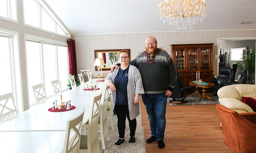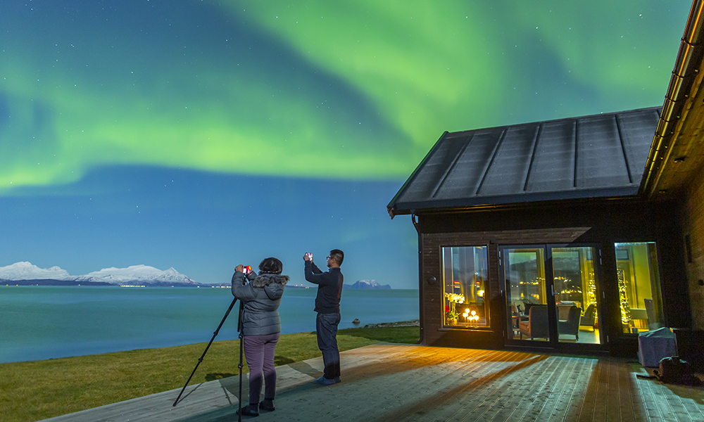 – Slå deg ned i sofaen! Dette skal være et hjem borte fra hjemmet, smiler Svein Jacobsen, sjefen på Arctic Panorama Lodge på Uløya i Lyngen – og peker mot det enorme panoramavinduet i øst. Fjellene stuper rett ned i sjøen, fjorden skinner. En fiskeskøyte tøffer over sjøen, kanskje på vei til handelsplassen i Havnnes med fersk fangst. Og så kommer kona Aud Sola Haugen ut fra kjøkkenet med karbonadesmørbrød og kaffe. Snakk om avslappende luksus!