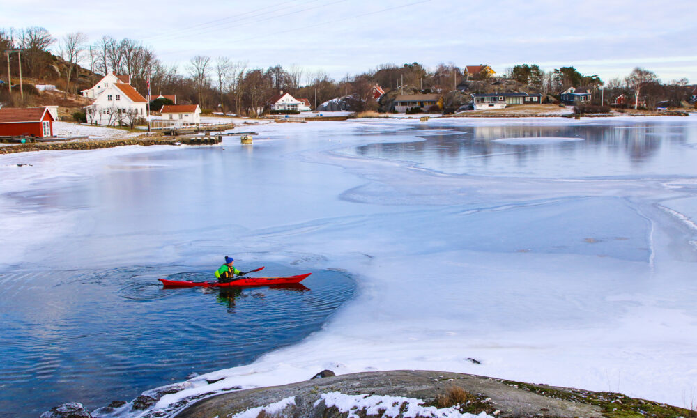 Isen ligger tykk inne i fjorden ved Scandic Havna Tjøme, så vi må bære kajakkene til yttersiden av småbåthavna for å finne åpen sjø. Et par sjøfugler flakser forbi mens Tine Raisbæk (40) gjør de siste forberedelsene før vi er klare for en aktivitetsform de færreste forbinder med minusgrader og vinter.