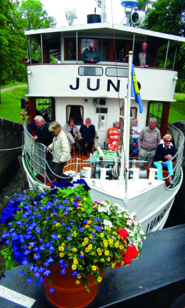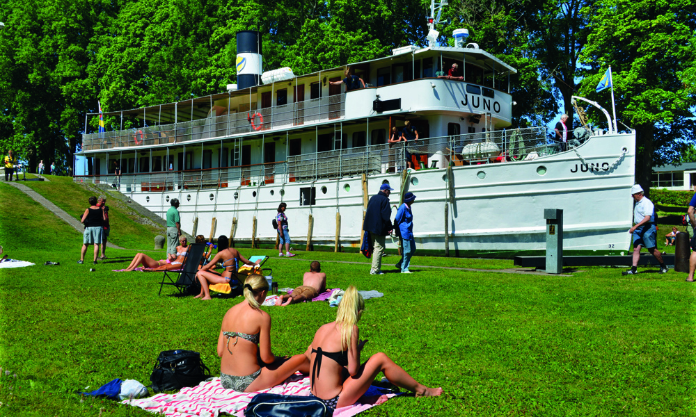Som vi formelt ikke er inne i før vi har seilt over Vänern, Sveriges største og Europas tredje største innsjø. Fram til Vänern seiler vi på Trollhättan kanal. Ikke at det har noe å si for stemningen om bord – her har roen allerede senket seg og passasjerene har funnet sin plass i solen.