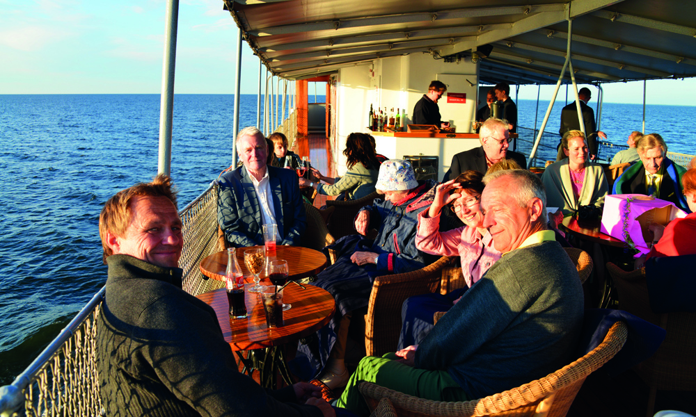 Mens passasjerene nyter sola på dekk, suser verden forbi i sakte fart. Foto: Torild Moland