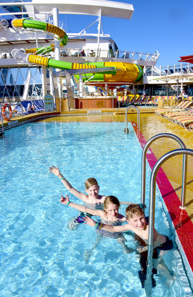Dette er det eneste jeg ikke forstår med RCL, som i all hovedsak er svært innovative og bygger fantastiske skip. Hvorfor må bassengene være så små? Symphony har tre sklier, to basseng, et barnebasseng og flere boblebad, men det er på langt nær nok til å romme over 6000 mennesker på en solrik dag. Her blir det trangt om plassen! Tips til de voksne – gå inn i Solarium foran på skipet, der er det også et lite basseng.
