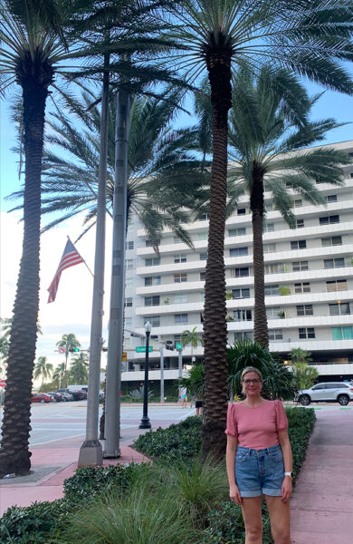 Siden vi ikke har mye tid i Miami før vi skal ombord på cruisebåten, har vi sjekket opp en del på forhånd om området vi bor i så vi kan få sett mest mulig her. Bare en kjapp tur innom hotellet for å skifte til sommerklær, så er vi ute av døra for å utforske. Skikkelig koselig strøk her vi bor, med fine bygninger, palmer og yrende liv. En 13-åring og en 40-åring har litt forskjellige ønsker om hva de vil gjøre. Så vi går for ønskene til 13 åringen først, shopping og Target med jul overalt. Og spise på Burger King.