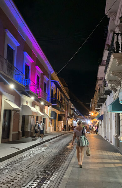 I gamlebyen i San juan er det fult av gamle flotte bygg i sterke farger. Jeg elsker å gå sånn gatelangs å titte på gamle hus, bakgårder og titte inn i de små butikker med rare ting. Plutselig blir det mørkt og overalt er det flotte lys som lyser opp bygningene. Gatene er fulle av liv og vi setter oss ned på en fortauskafé å bare titter på folk og hører på lydene rundt oss. Dette stedet vil vi tilbake til. Så fullt av liv, men likevel så avslappende stemning.