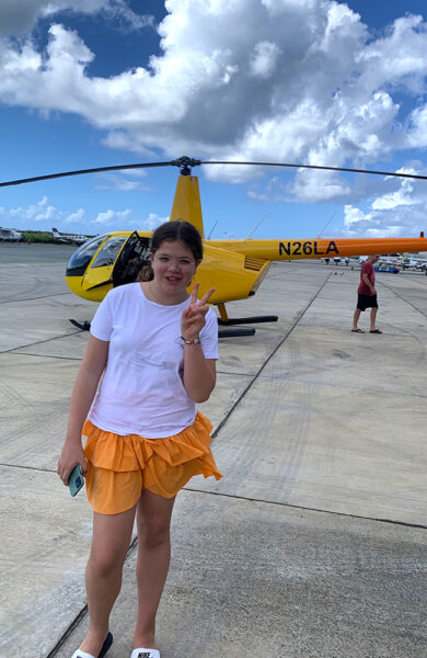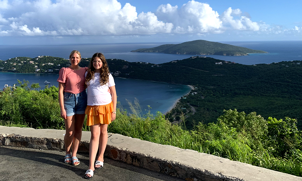 Vi flyr ut fra Saint Thomas og over havet til Saint Croix. Havet er utrolig blått. Vi ser korallrev, lange hvite sandstrender og til og med noen skilpadder fra helikopteret. Den ene siden av Saint Croix heter Fredrikstad, noe vi selvfølgelig synes er gøy siden det er hjembyen vår. Vi flyr tilbake over Saint John som består av 70 prosent nasjonalpark, før vi flyr tilbake og får se skipet vårt MSC Seashore ovenfra. Det var en helt fantastisk tur og noe av det morsomste vi har opplevd.
