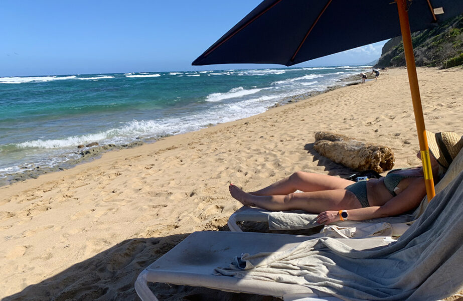 I den vakre viken hvor stranden ligger blir vi tatt i mot med karibisk musikk og velkomstdrink. Her er det muligheter for både kajakk, SUP, zipline og snorkling, men vinden er ganske kraftig, og det er store bølger så ingen av delene var mulige i dag. Noe vi synes var ganske deilig, for da kunne vi ligge på solsenger og se utover det vakre blå havet. Bare nyte varmen, hente seg kald drikke i baren og slappe av. Vi prøvde oss også på en svøm i havet, som var ganske gøy i bølgene.