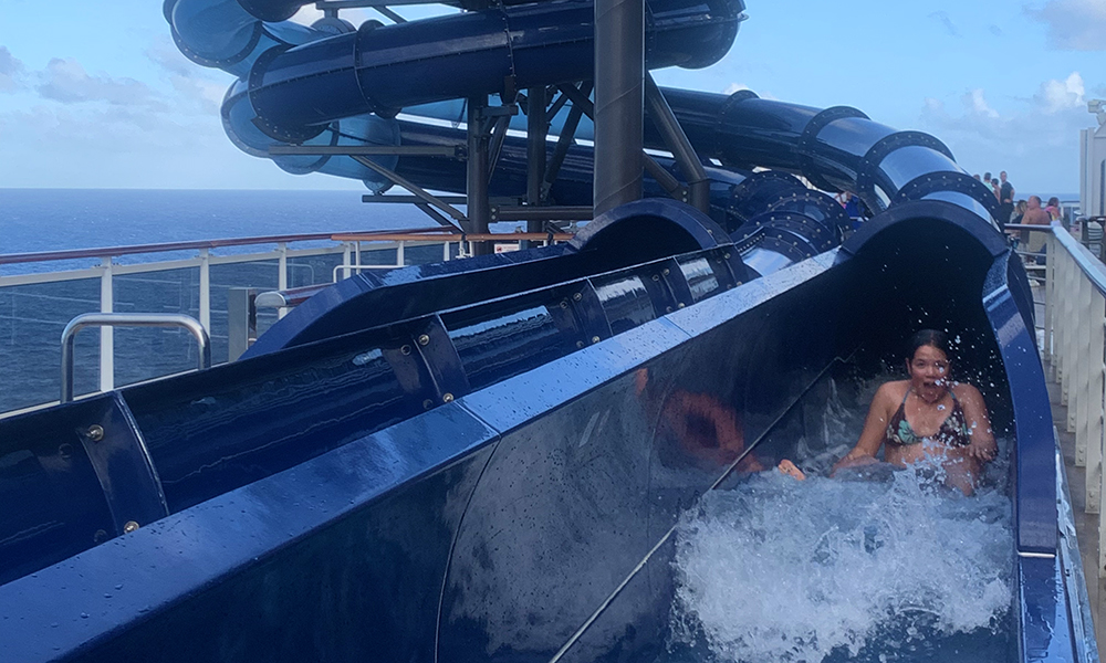 Vannskliene er høyt oppe på toppen av skipet og litt på utsiden. Vi hentet en oppblåsbar ring med plass til to og kastet oss utfor. Det kilte ordentlig i magen og vi måtte rett og slett ta oss noe kaldt å drikke etterpå. Litt stolte av oss selv. Ann Sofie fikk til og med blod på tann og tok alle de ulike vannskliene flere ganger i timevis. Jeg holdt meg til solstolen.