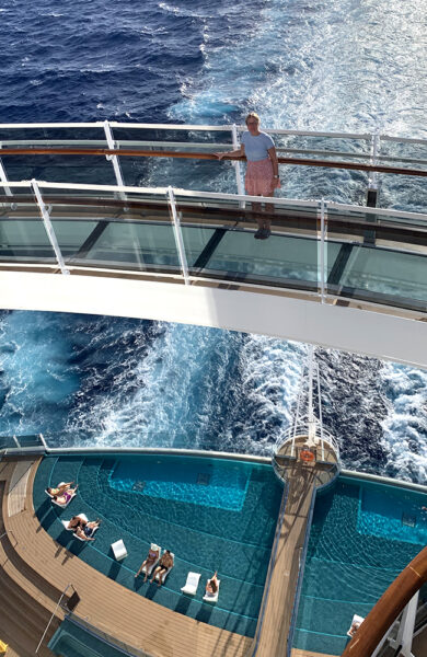 Vi går tidlig opp på dekk og finner solstoler så vi kan kose oss og slappe av den siste dagen. Vi har holdt et høyt tempo hele uken, for vi liker å få med oss det meste som skjer – vi vil ikke føle at vi gikk glipp av noe når vi kommer hjem. Varmen er så utrolig deilig selv om vi er midt på havet, vi passer på å suge til oss alt av sol vi klarer før vi skal hjem til vinter i Norge.