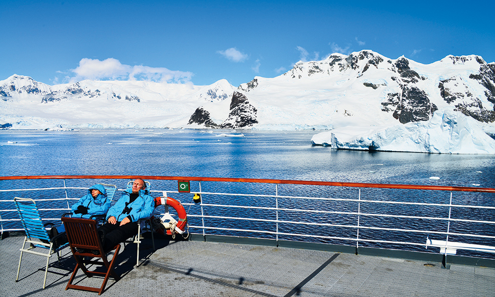 Sjøsyketabletter byttes raskt ut med champagne i boblebadet på dekk, mens skipet venter på at et 500 meter bredt isflak som stenger passasjen i Lemairekanalen skal flytte på seg.