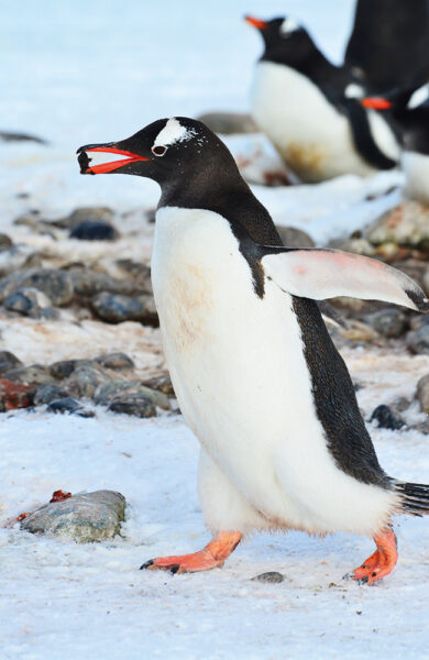 Den polare vinteren er på hell, men fortsatt dekker hvit snø mesteparten av bakken, og pingvinene jobber iherdig med å bygge sine reder av stein.