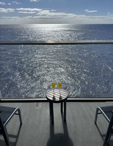 Det var magisk å våkne til blått hav så langt øyet kan se. De vakre blåfargene, den friske sjøbrisen og lyden av havet ga følelsen av ro i sjelen. Med den perfekte utsikten fra vår egen balkong bestemte vi oss for å nyte en rolig morgen der. For en herlig start på dagen, og den ble enda bedre da Mimosa’en kom på plass.