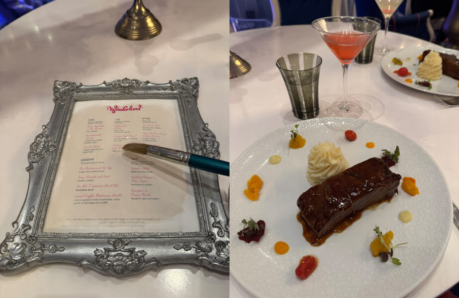 Ettersom det var siste kveld på skipet, hadde vi booket middag på Wonderland, en spennende restaurant med Alice in Wonderland tema. Alt var utrolig flott gjennomført, både når det kom til interiør og maten som ble servert. For å kunne lese menyen måtte vi bruke malepensel dyppet i vann for å få frem den usynlige skriften. Veldig gøy! Både mat og drinker var utrolig godt, og alle rettene var både kreative og lekne. Utrolig spennende både for barn og voksne.
