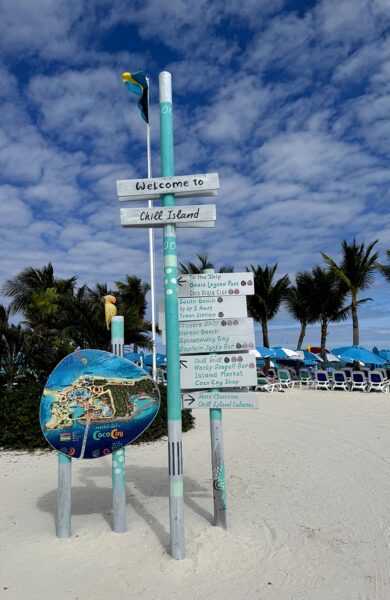 Selv startet vi dagen på området Chill Island, der vi slappet av med både soling og bading. Ettersom denne øya er Royal Caribbeans private øy, kunne vi spise og drikke på de forskjellige stedene akkurat som om vi fremdeles var på skipet. Vi testet ut den populære drinken Miami Vice, 50/50 Strawberry Daquiri og Pina Colada. En mer forfriskende sommerdrink skal du lete lenge etter!