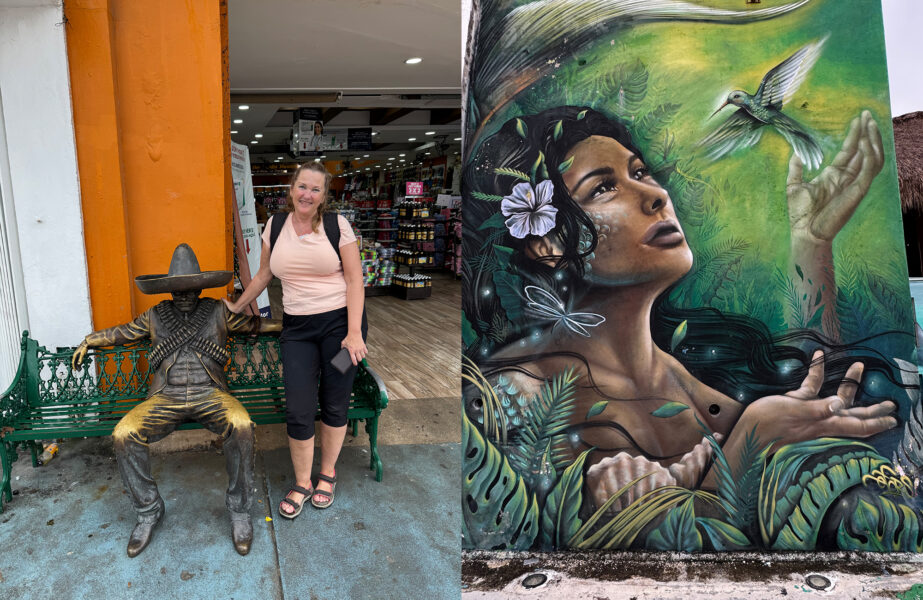 Etter en liten stund stoppet regnet og vi gikk spent i land for å utforske øya. Vi tok taxi inn til sentrum av byen San Miguel de Cozumel. Her gikk vi rundt og vandret i gatene i flere timer. En koselig liten by full av fargerike bygninger og sjarmerende butikker. Byen er blant annet kjent for all den fargerike gatekunsten, så vi bestemte oss for å tusle litt rundt i sidegater på jakt etter fargefulle veggmalerier. Vi fant flere av dem og var veldig fornøyd med dagens eventyr, til tross for at planene ble litt endret i siste liten.
