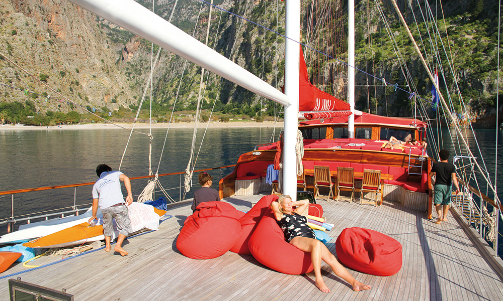 – Jeg dro på mitt første guletcruise i 2005. Siden har jeg vært med to ganger i året, alltid på denne båten. Det er den beste ferieformen for meg, røper nederlandske Danielle mens hun ligger på de deilige sakkosekkene på dekk av skipet og leser en bok.