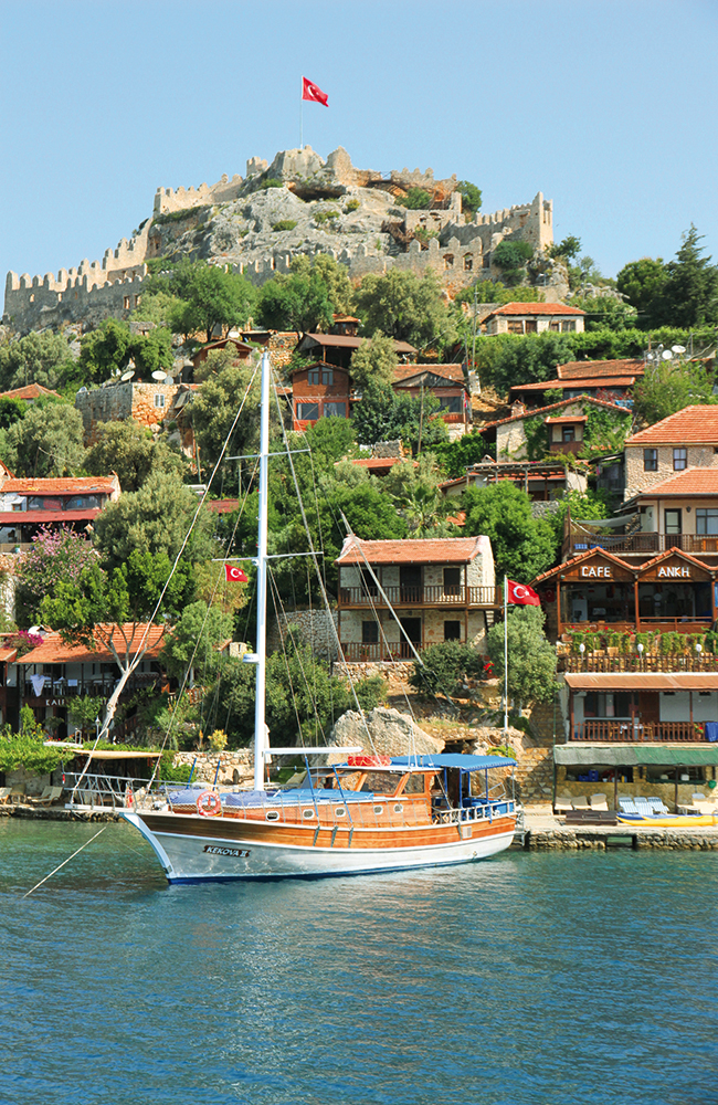 I dag seiler vi sakte over ruinene som ligger flere meter under vann, mens vi fortsatt kan se konturene av murvegger og husstruktur. Øya er ubebodd, men får besøk av skuelystne turister hver dag, mange av dem på dagstur fra Demra. Det er ikke lov å dykke eller snorkle over ruinene, men på grunn av det klare vannet er det greit å se fra båten. Vårt skip legger inn en stopp i Kaleköy, en tradisjonell fiskelandsby bare noen hundre meter unna ruinbyen under vann. Her har lite forandret seg de siste århundrene, og den mektige festningen ruver majestetisk over den lille bosetningen mens lykiske gravkammer pryder sletten nedenfor.