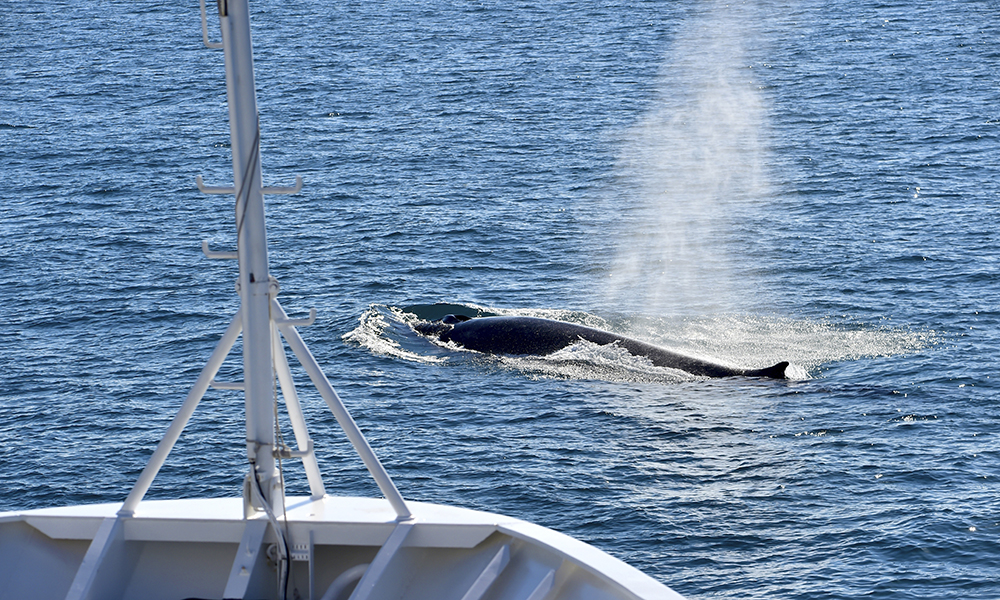 Etter et kvarters show, med kunstferdige hopp og hyppig blåsing, syns hvalen det er nok, og tar seg en tur i dypet. Siden kommer også en finnhval langs skutesiden, og viser oss ryggen av sin rundt 20 meter lange kropp. Imponerende!