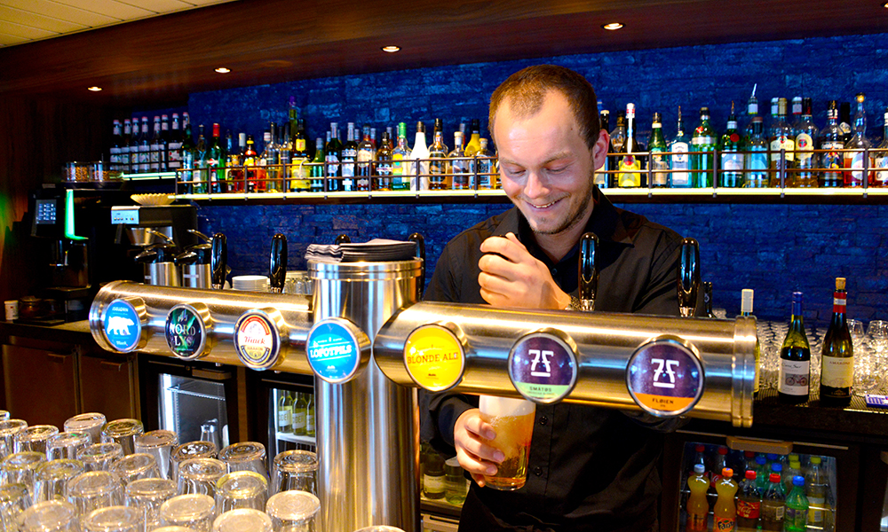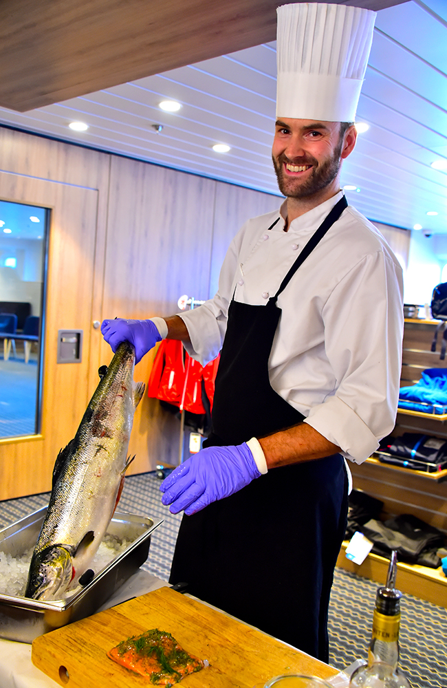 Tilbake om bord er det vår tur til å få både fast og flytende føde. Og for et kalas! Hurtigruten har satset stort på å utvikle menyen om bord, så det er slutt på pizza, øl og svette hamburgere. Heldigvis. I dag følger menyen norskekystens tradisjoner, fra smalahove til klippfisk, trøndersodd og lutefisk.