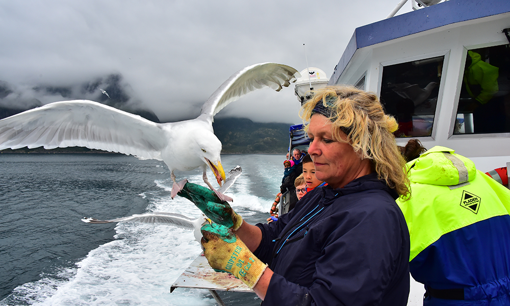 Det gjør også måkene. For mens båten putrer ut av sundet, får den et stadig større haleheng av hvite, gaukende fugler. Ikke rart – for langs rekka står Siv Myklebust (54) og Asta Sigurdadottir (34) og kaster godbiter til måkene. Hva skal vi med ørn, når vi har måker?