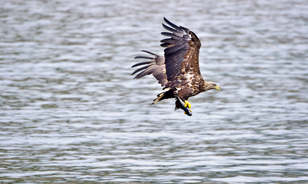 Jammen meg, der kommer den seilende. Hun kaster noen fiskebiter i vannet, som ørnen sikter inn mot og plukker opp med klørne i flygende fart. Dette har de gjort før, begge to. Siv har jobba med ørnesafari i 18 år, og hevder hun alltid ser rovfuglene på sine turer. I naturen har man ingen garanti, men sjansene er åpenbart store.
