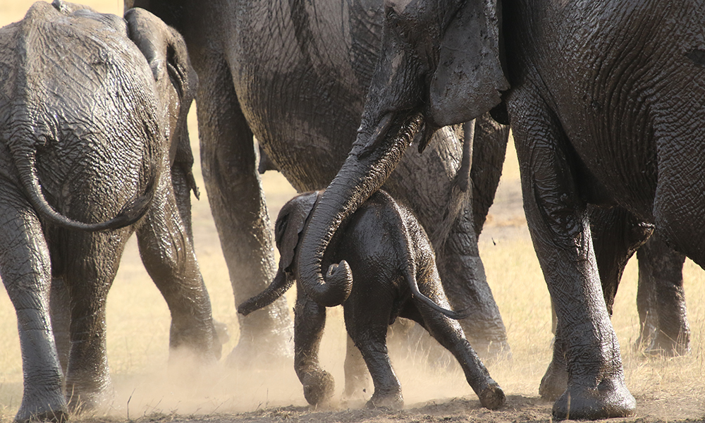 Herfra har vi orkesterplass til et vannhull, hvor en elefantflokk er i full gang med et litt mindre pikant morgenritual. Det betyr vask, gjørmebad og mye støv. Babyelefanter presser seg mellom beina til de voksne gigantene for å få plass i søla.