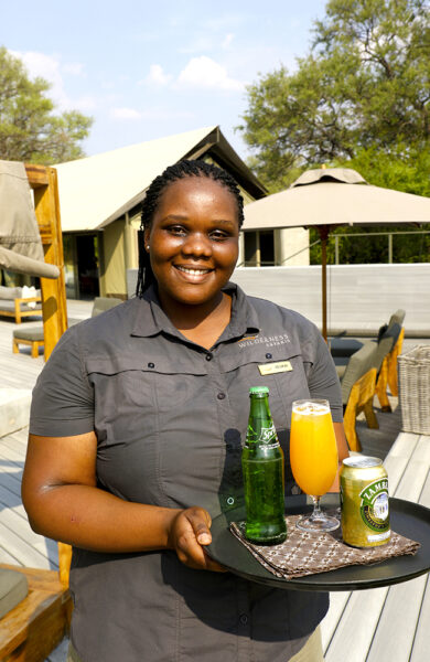 Det er tid for lunsj, og sjåføren cruiser inn mot Davisons´s Camp, en av lodgene som drives av Wilderness Safaris. Selskapet som er svært opptatt av bærekraftig drift og økovennlige konsepter disponerer private områder – såkalt konsesjoner – inne i nasjonalparken hvor de selv håndhever reglene. Dette er kostbar luksus, men med skyhøy standard.