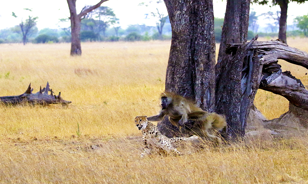 Det er ikke hverdagskost å se geparder i Zimbabwe. Denne bavianen synes utvilsomt at de lynraske rovdyrene bør holde seg langt unna. Foto: Runat Larsen